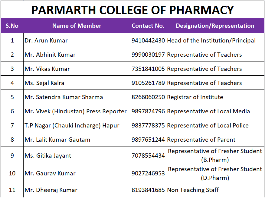 In view of the directions of the Hon’ble Supreme Court, AICTE, PCI and UGC, ragging is a criminal offence. It is mandatory for every technical institution to take the necessary action and steps to prevent, curb and eliminate the menace of ragging in the campus and hostel. The anti-ragging squad is constituted with following members for session 2023-24. The following members are directed to work as per the direction of AICTE, PCI and university.